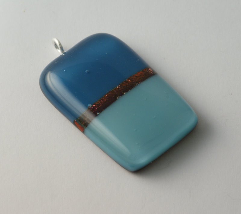 For the second pendant: the bottom layer is 2mm black opal. The patterned layer is made using strips of steel blue opal to hide the hanging hook,one strip of pre-fired Bullseye of contrasting colour and then possibly light cyan opal. This is then topped with 2mm clear glass.