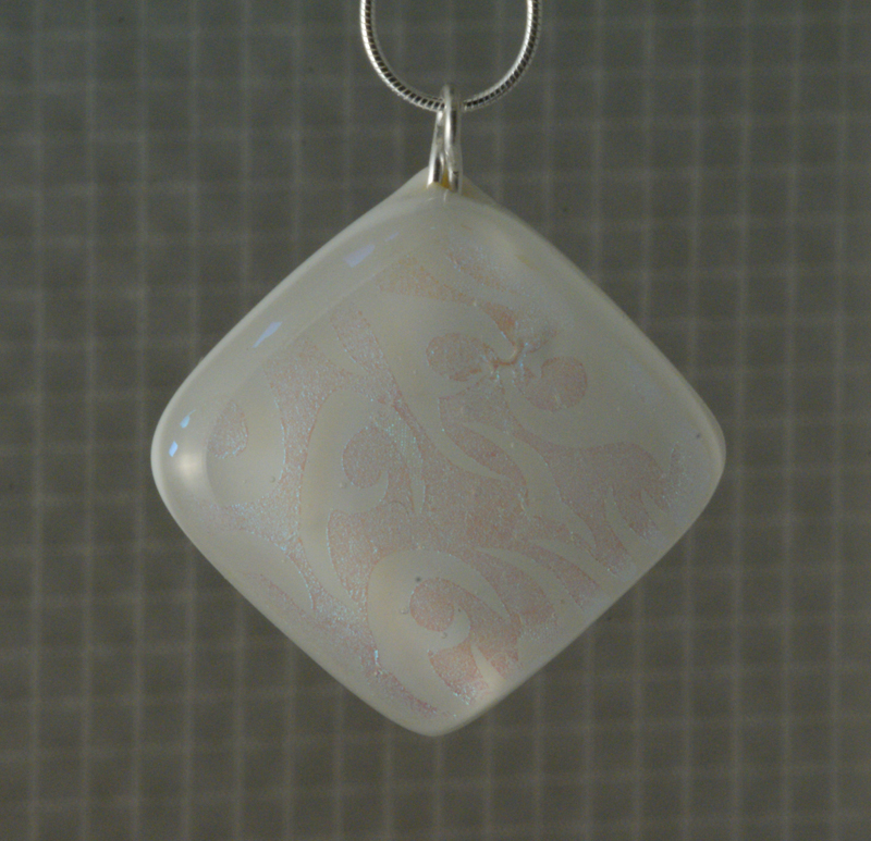 The original pendant I made for her used one of the free samples of dichroic glass which WarmGlass send with their packages of glass. In the light it flashed purple/pink and looked lovely on the white glass - however this effect almost disappeared in daylight after firing. Whilst it would make a great pendant for a bridesmaid, for a girl who liked 'pink' I didn't feel that it would make the grade - hence the previous pendant.