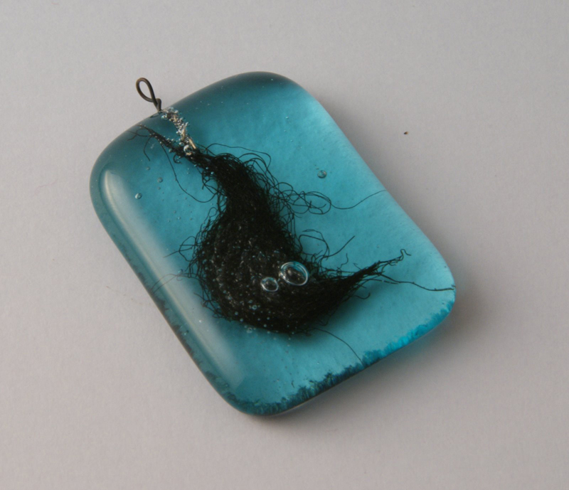 So some steel wool was teased out and placed between turquoise transparent and clear glass and then fused. The hanging hook was a small piece of nichrome wire.