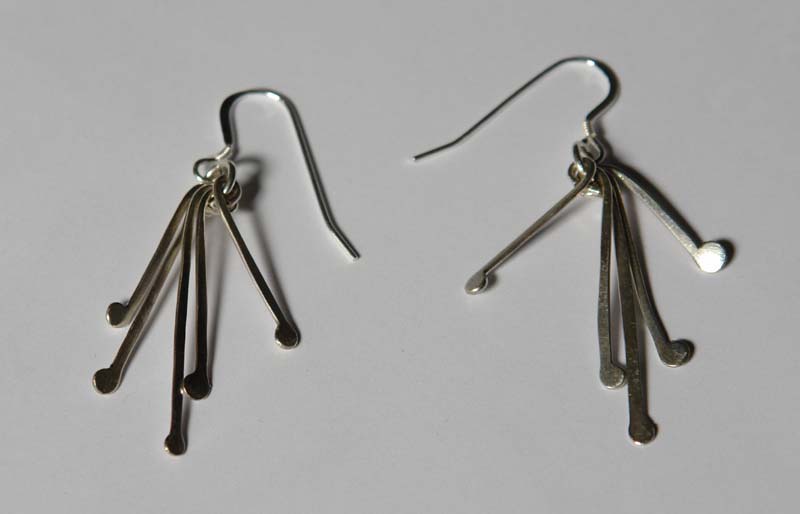 These were the first item of jewellery I made after starting a course at my local college. Various lengths of silver wire are cut and one end is melted into a blob of silver. The other end is bent round to form a loop. The whole thing is then hammered flat and polished up. Very easy, and no soldering involved!