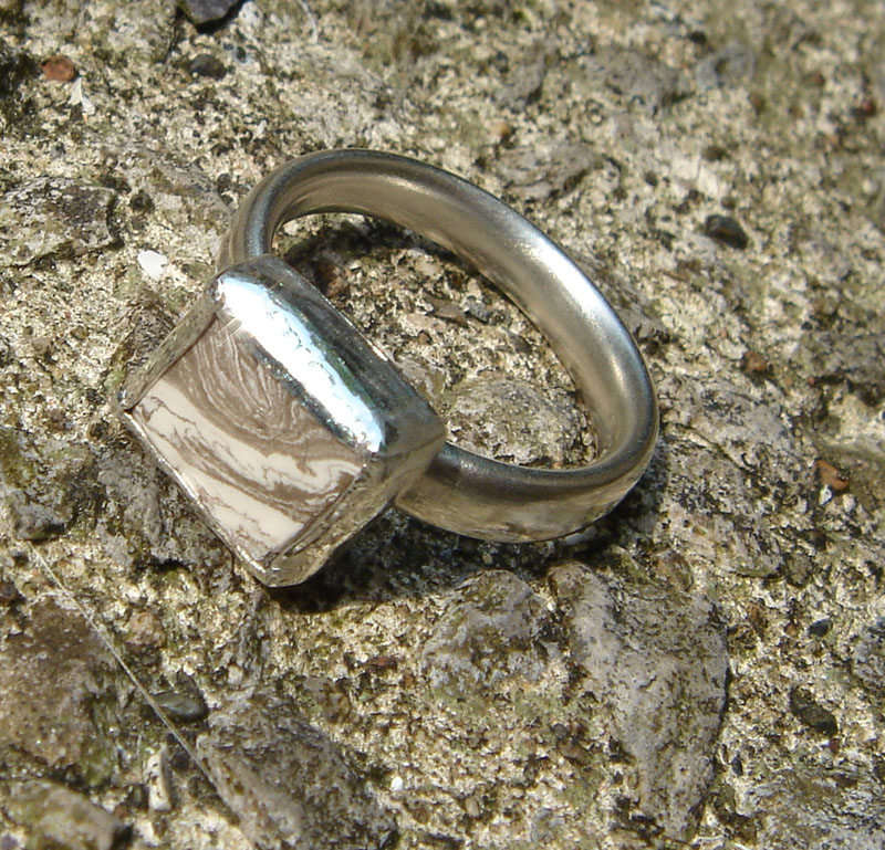 The 'stone' for this ring was made in my ceramics class - were were experimenting with marbling together two different coloured stoneware clays. As there were some pieces left over, I glazed and fired small pieces suitable for setting in a ring (in my silversmithing class).
