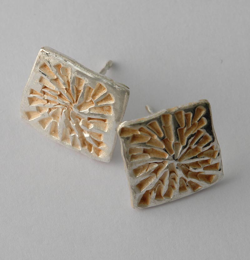 These earrings are made of squares of fine silver which has been punched and then slightly domed. A silver ear post is soldered on the back. The back of the earring and the post are painted with black lacquer and the earring is then etched in ferric nitrate (the lacquer protects the pin from being etched away). After cleaning off the lacquer, the front/edges of the earring are burnished to a high polish.