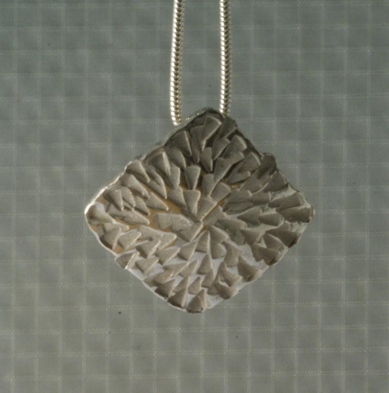 As for the earrings, the square was slightly domed after punching. A loop was soldered to the back of the pendant before protecting with black lacquer. After etching in ferric nitrate the pendant was burnished to highlight the contrast between silver/etched portions.