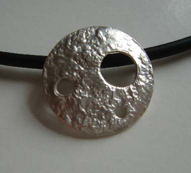 A hanging loop was soldered to the back and the finished pendant was then hung on a rubber necklet from Cooksons.