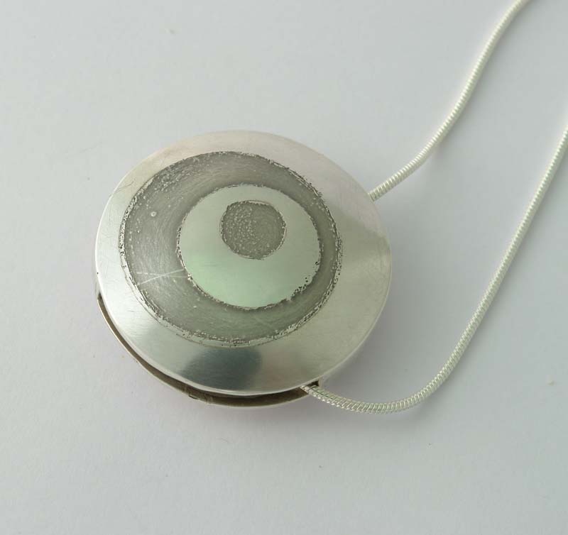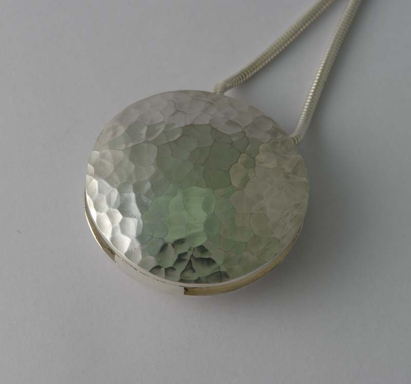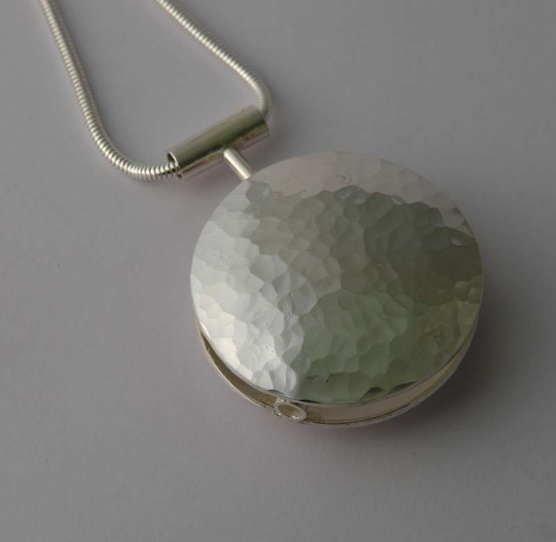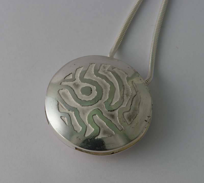One side of the pendant was textured with a ball pein hammer. The other side was etched with a design. The finished pendant was suspended on a silver snake chain from Cooksons.